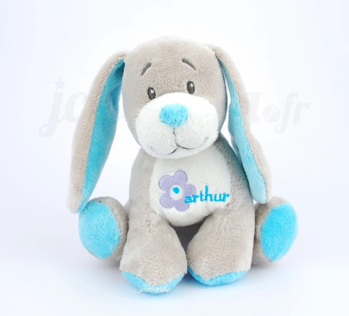 Son corps est principalement gris avec un peu de blanc sur le museau et le ventre. Ses oreilles et ses pattes sont en partie bleu, une couleur qu’on retrouve sur son nez en tissu. Il a les sourcils et les yeux brodés. Sur le ventre, une joli fleur violette et l’inscription « arthur » (référence à la marque « Arthur et Lola ») sont joliment brodés. C’est une peluche de taille idéale pour les tout-petits (environ 20 cm), que l’on peut offrir dès la naissance.
