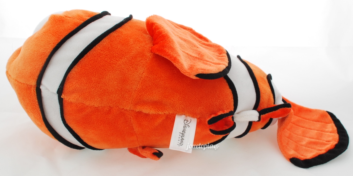 C’est une grande peluche de Nemo, 40 cm de long pour environ 20 cm de hauteur (en comptant la nageoire dorsale), et plutôt agréable au toucher. Ses gros yeux sont en tissu brodés et ses nageoires brillent à la lumière, comme dans le film ! Elle est bien sûr conforme aux normes européennes (CE) et ravira tous les fans du film, de Pixar et tous ceux qui aiment les poissons.